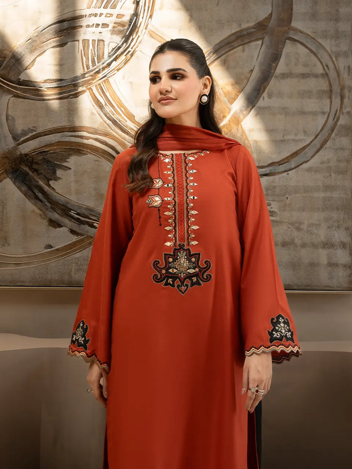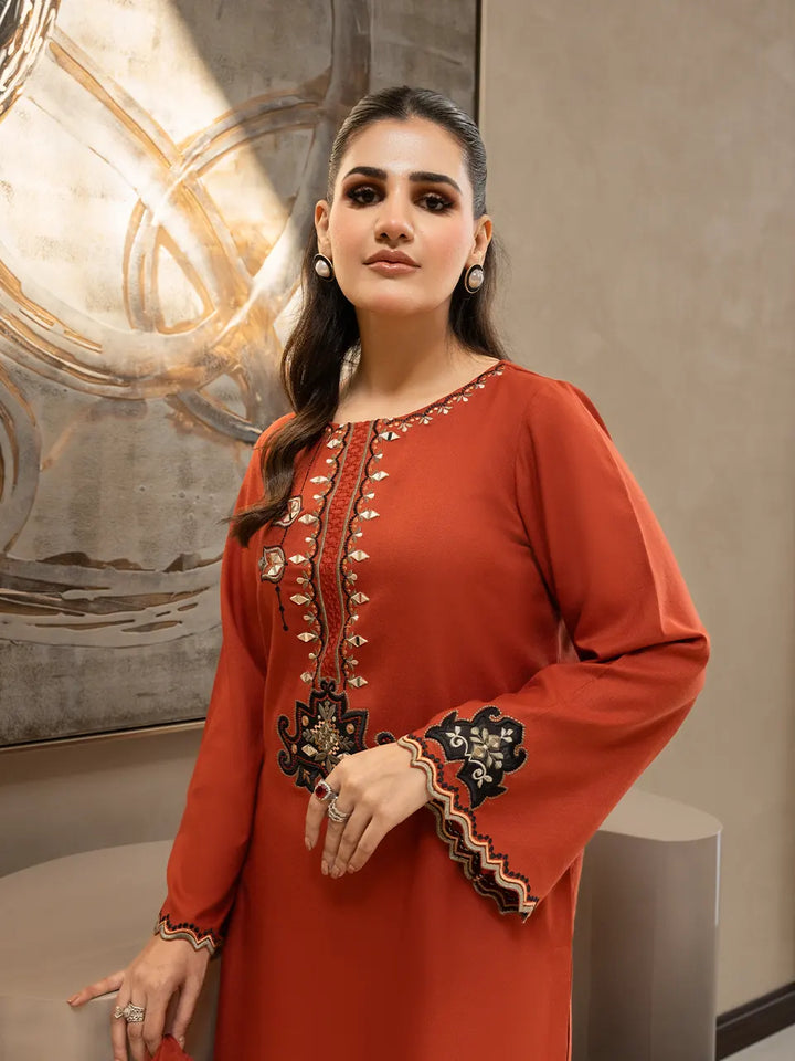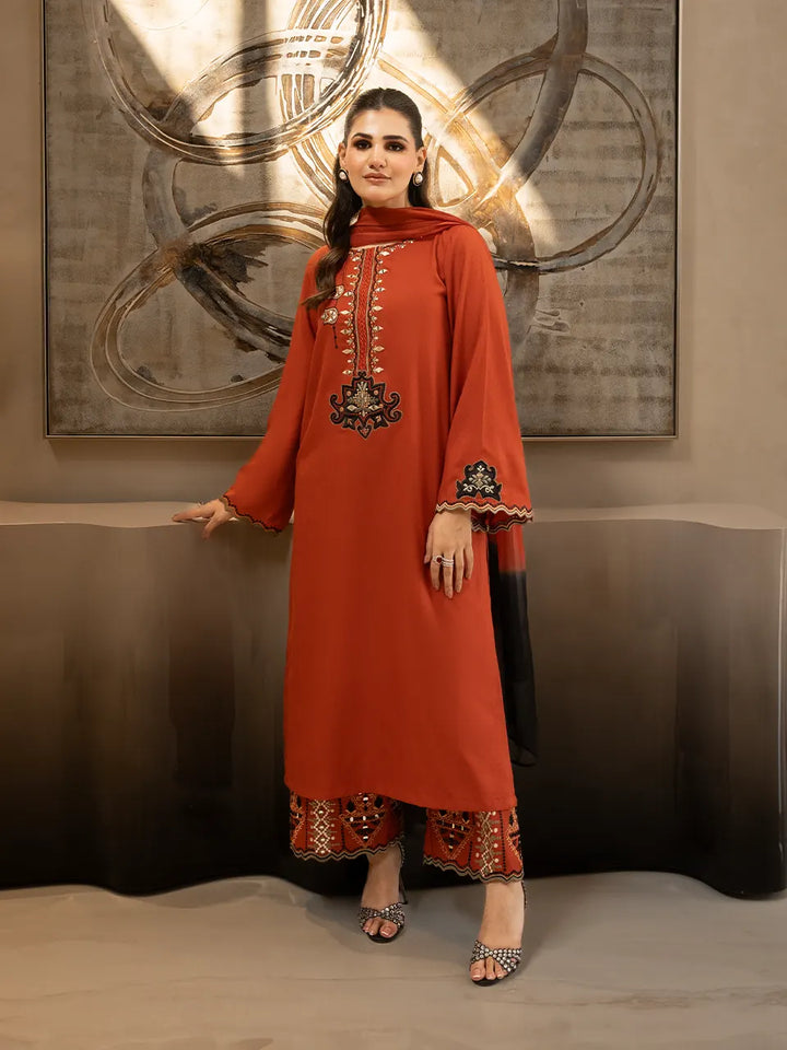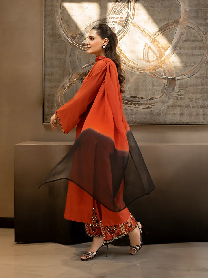 Bask in the warm glow of our Burnt Orange Karandi ensemble, a celebration of craftsmanship and seasonal charm. Crafted from breathable, textured Karandi, this ensemble offers natural elegance—perfect for daytime festivities and evening gatherings. Intricate mirror work paired with delicate hand embroidery adds a festive shimmer and artisanal charm, making this piece a standout choice for any occasion.